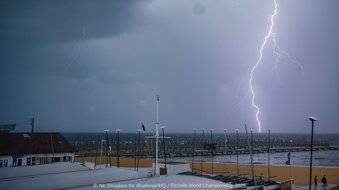A storm front with gale force wind and lightning, which then resulted in a lack of wind resulted in no racing on the third day of the Etchells World Championship 2025 from the Royal Brighton Yacht Club.